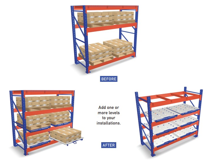Hand picking is now made easier with the Roll Out Pallet installed directly on the floor and sliding the material out of the rack. Safe and efficient they roll on tracks installed on the floor so no one can take them out of the place. Made out of thick steel and heavy duty rollers, they withstand the harshest environments. The standard brake system securely holds the Roll Out Pallet in place when the lift is loading it. No more dangerous handling. Additionally, since you no longer need to crawl under to access your material, you can gain the extra space by lowering first level of beams.