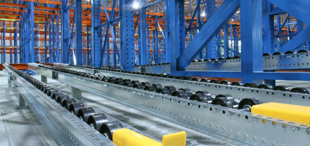 Les palettiers à accumulation dynamique sont généralement utilisés pour deux types d'applications : (par exemple deux palettes de profondeur), pour les applications de préparation de commandes. Nous nous concentrons ici sur les systèmes à accumulation dynamique grande profondeur. Les systèmes à accumulation dynamique grande profondeur supposent l’utilisation de convoyeurs à approvisionnement par gravité pour le chargement des palettes. Les allées doivent être équipées soit de rails à rouleaux (moins chers, mais nécessitant une meilleure qualité de palette), soit de rouleaux pleine largeur (plus chers, mais plus faciles si l’on veut faire circuler une variété de types/qualités de palettes). Le stockage à grande profondeur sur palettier à accumulation dynamique nécessite également des freins en ligne appropriés pour éviter les palettes à la dérive. -