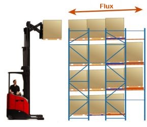 Pour charger l'allée, la première palette chargée dans l'allée est chargée sur le chariot supérieur. Pour charger la palette suivante dans l'allée, le cariste s'aligne devant la première palette et la pousse, ce qui fait reculer la première palette loin de la face de prélèvement et expose le chariot suivant, sur lequel la deuxième palette peut être déchargée, une fois qu'elle est en position. Le processus est répété jusqu'à ce que l’allée soit pleine. Pour vider l’allée, le cariste retire lentement la dernière palette et les autres roulent vers l'avant, jusqu'à la face de prélèvement. De la même manière, le processus se poursuit jusqu'à ce que l’allée soit vide.